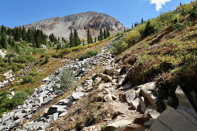 The trail turns south and holds the 10,800-foot contour while passing rivers of talus and old growth spruce with swooping trunks. Views of the San Miguel Mountains are captivating. Below, the intimidating northeast ridge of San Miguel Peak and Point 13,088' are glowing in morning light.