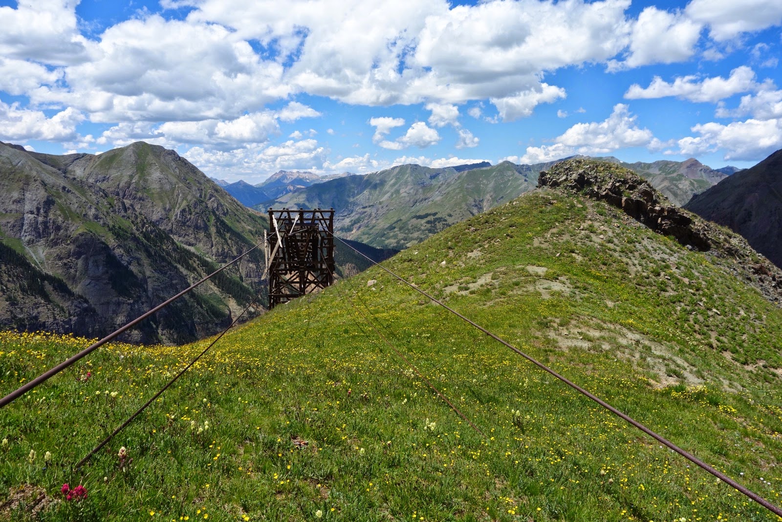 Buffalo Boy Mine: Heading generally southeast, walk up the road 0.9 mile to the Buffalo Boy Mine in the upper basin at 12,600 feet. Prospectors were after both silver and gold. You will find railroad tracks, and cables still strung between aerial tramway support structures. Behind all this is the return ridge from Canby.