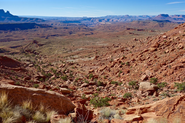 Upon arriving at the White Rim Road at 4.8 miles, turn left. Our route utilizes 1.3 miles of the 100 mile 4WD and mountain bike route that loops around I-Sky. Murphy Hogback is one of the permitted camping sites and there are pit toilets in this area. I highly recommend doing a 1.5 mile roundtrip spur to the western end of the Hogback. At the crest in the road, turn right/west and walk off-trail on White Rim Sandstone, nature's slab path. The image below shows the narrowest portion.