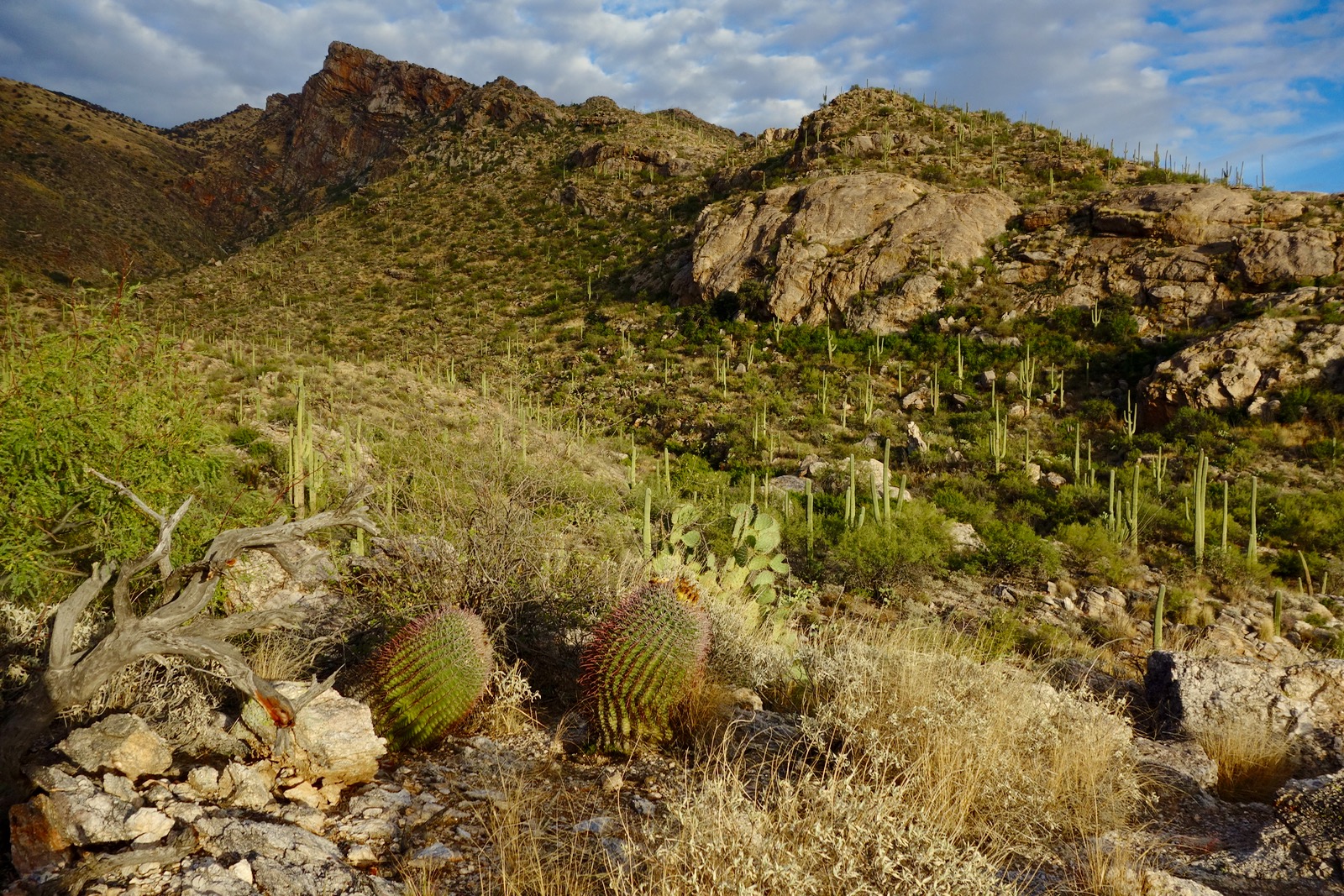 Return to Kimball Saddle and turn right on the Finger Rock Trail. I have described this trail in a previous post: Mount Kimball, 7,258': Pima Canyon to Finger Rock Canyon. If you are unfamiliar with this beautiful pathway, please consult the link. You can trim the mileage by 0.2 and elevation gain by 50 feet if you do not visit Linda Vista Saddle on your way home. The lighting is superb every evening on the Finger Rock Trail. This is the golden hour when delicate grasses are backlit and the massive ridge ablaze.