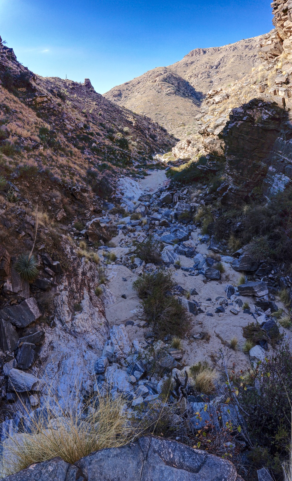 From the four-way junction the pathway drops 820 feet over 1.9 miles to the Skyridge Trailhead. This pathway is close to perfect--packed dirt with almost no rock, roomy enough to pass, gentle grade, and ceaselessly beautiful. Skyline carries a steady stream of bikers, runners, hikers, and dogs.
