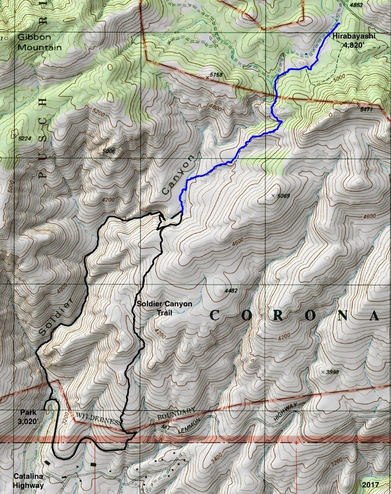 The lateral trail descends southeast for half a mile to Horse Gulch Road. A dirt track winds through rocky passages.