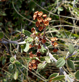 An ancient alligator juniper holds down the center of the ridge. Graythorn (distinguished by the Mercedes symbol on spent flower heads) and heavy brush are a little annoying in places.