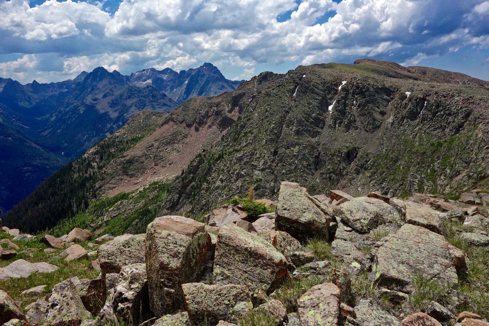 An outcrop bulges from the west slope of South Snowdon at 3.3 miles, 12,500 feet. The image below was taken on the return hike to get a better perspective on this location. The outcrop is image-center and South Snowdon is image-right. There's lots of room to roam on the big talus blocks that pitch up to the ridge.