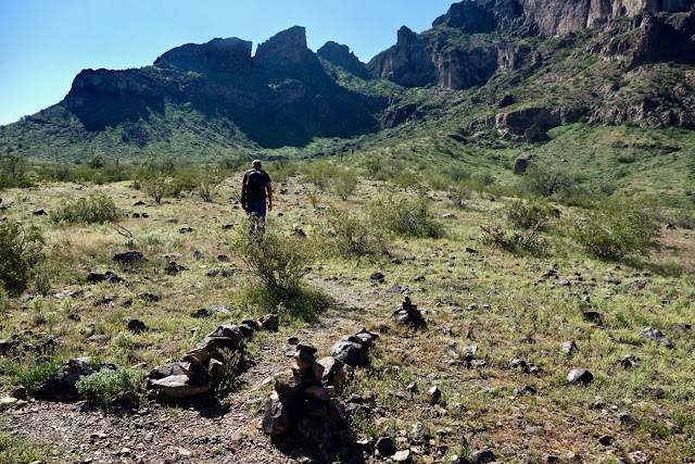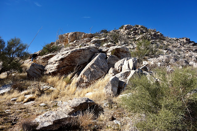 Weathered boulders are piled up along the banks of arroyos and on the bajada. Cross the broad and beautiful stony wash at 2,540 feet. At 1.2 miles, pass by a hapless boulder with a white arrow pointing the way to the "top". Steadily the boulders increase in size, the clambering begins, and the pace slows. It is a rock fest from here to the summit.