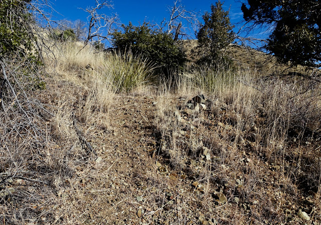 Descend 40 feet into a minor saddle and locate a faint social trail. The footpath comes and goes but it stays on the ridgeline. There's an exhilarating sense of being on a ridge, yet it is free of obstacles and exposure. Ascend through a grove of Arizona oak.
