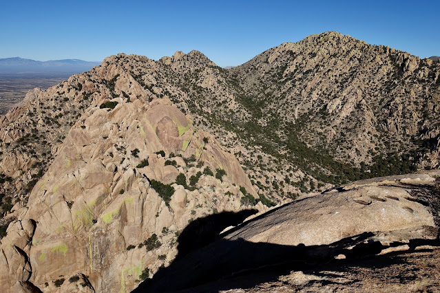 Having seen Thunderbird time and again from Linda Vista I've long considered it to be the entrance gate to some of the most wondrous features in the Pusch Ridge Wilderness. I contemplated approaching it from the lower end on the southwest ridge. Thank you Mike and Gregg for the suggestion to come at it from the north ridge and for crediting the name "Thunderbird" to field botanist David Bertelsen. (THW, photo)
