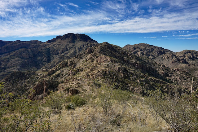 We were back at the exit saddle at 3.3 miles. There was a magnificent cane cholla with three bird nests. Looking at trip reports after our hike, there are other treasures in this area that we overlooked including a cave and a mine. Some people visit the mountain exclusively to find wild chiltepine pepper plants. Found only in the Coronado National Forest, they are the only native pepper in the United States. In 1999, the Forest Service designated the Wild Chile Reserve in the