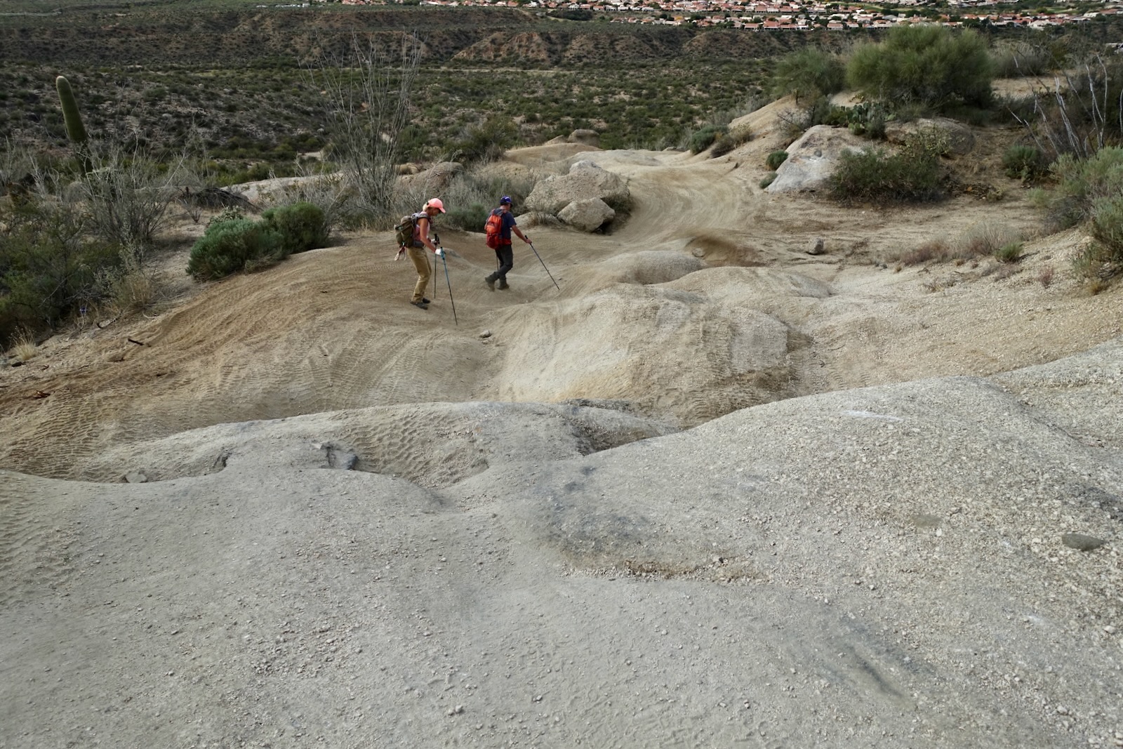 Catalina granite is a plutonic mass of igneous rock that formed when magma cooled and crystallized underground. It is widely exposed on the west flank of the Santa Catalina Mountains. Peak 5,961' is composed entirely of Catalina granite, a homogeneous, non-layered rock made up of tightly interlocking quartz, feldspar, and mica crystals. Large crystals are visible throughout the great sweeps of rock. As the rock disintegrates it leaves granular gravel called grus on the surface. It is intensely slippery! All three of us lost our footing walking back down the road.