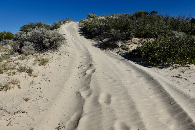 We went to end of the road at the top of a small rise, a full-on dune. Alternatively, the climb could be initiated at the base of the final pitch.