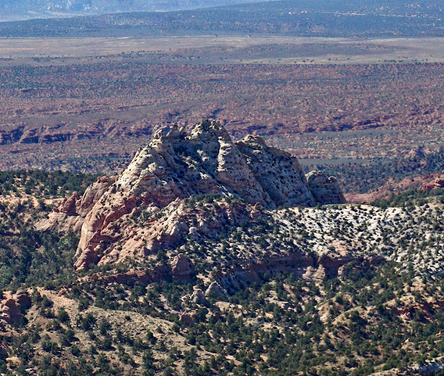 The apex is tiny but flat and thus, more comfortable than anywhere else on the summit ridge. The stones are covered in bird guano. With a rise of 1,251 feet and absolutely nothing impeding the full-circle field of vision, the views are expansive. I'm looking northwest toward No Mans Mesa and the White Cliffs. The Deer Range is image-right. The Pink Cliffs of Bryce Canyon are on the horizon. Navajo Mountain, distinguished by its softly rounded form, is visible off-image in the east. (THW, photo)