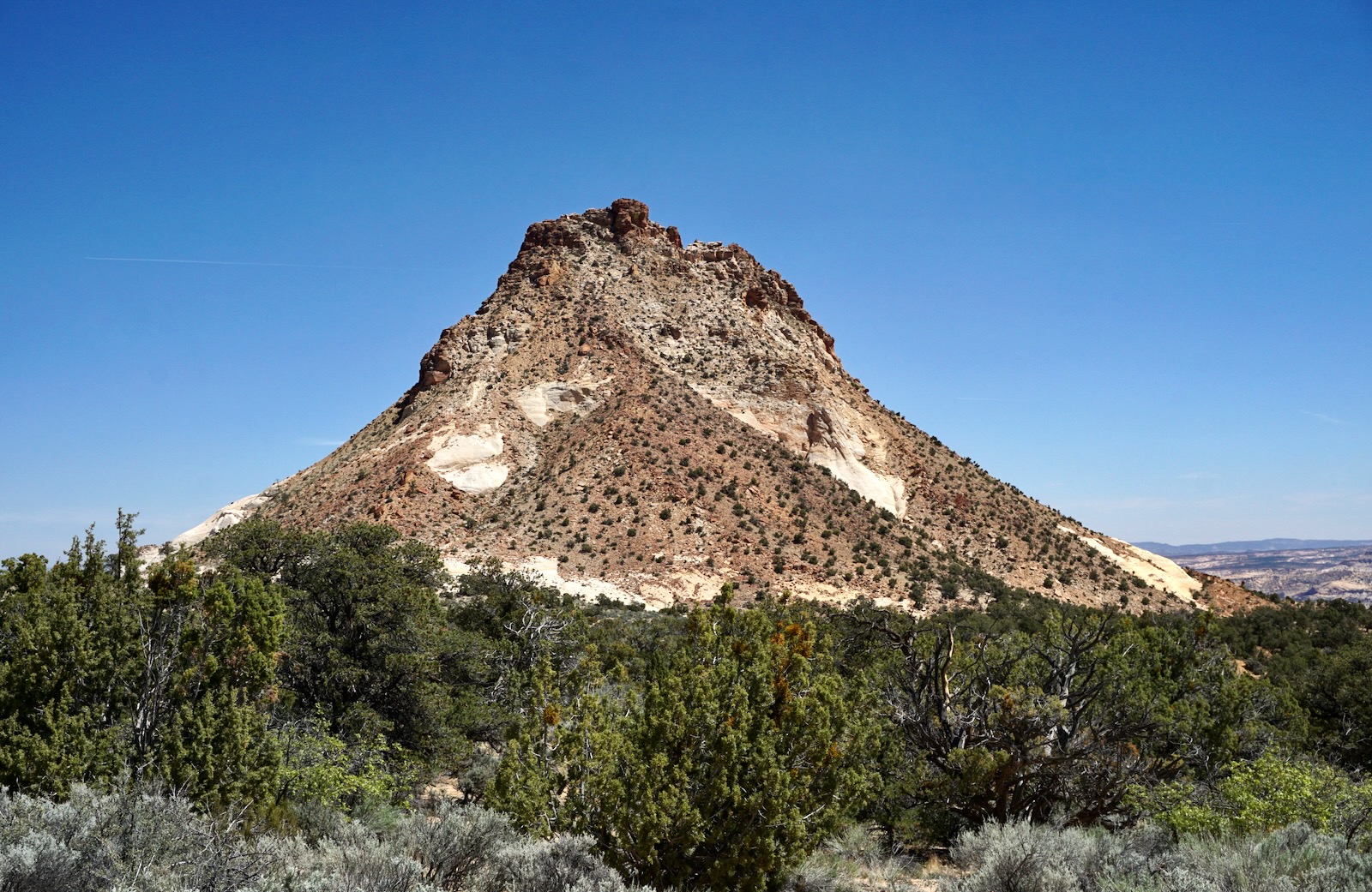 exceptionally resistant and colorful layer of iron-rich sandstone, a variation within the same formation. From US 89 between Page, Arizona and Kanab, Utah, the peak looks improbable, if not impossible. Five miles of deep sand walking on the access track is a long slog, followed by increasingly difficult challenges. No special skills are required for the Class 3 scramble on the summit block to the Moll Benchmark but exposure is extreme. Each climber will need to pause and consider whether the 30-foot near vertical wall with an effectively bottomless base is a risk they are willing to take. The hike is within the Paria-Hackberry Wilderness Study Area, a unit in the Grand Staircase-Escalante National Monument, administered by the Bureau of Land Management.