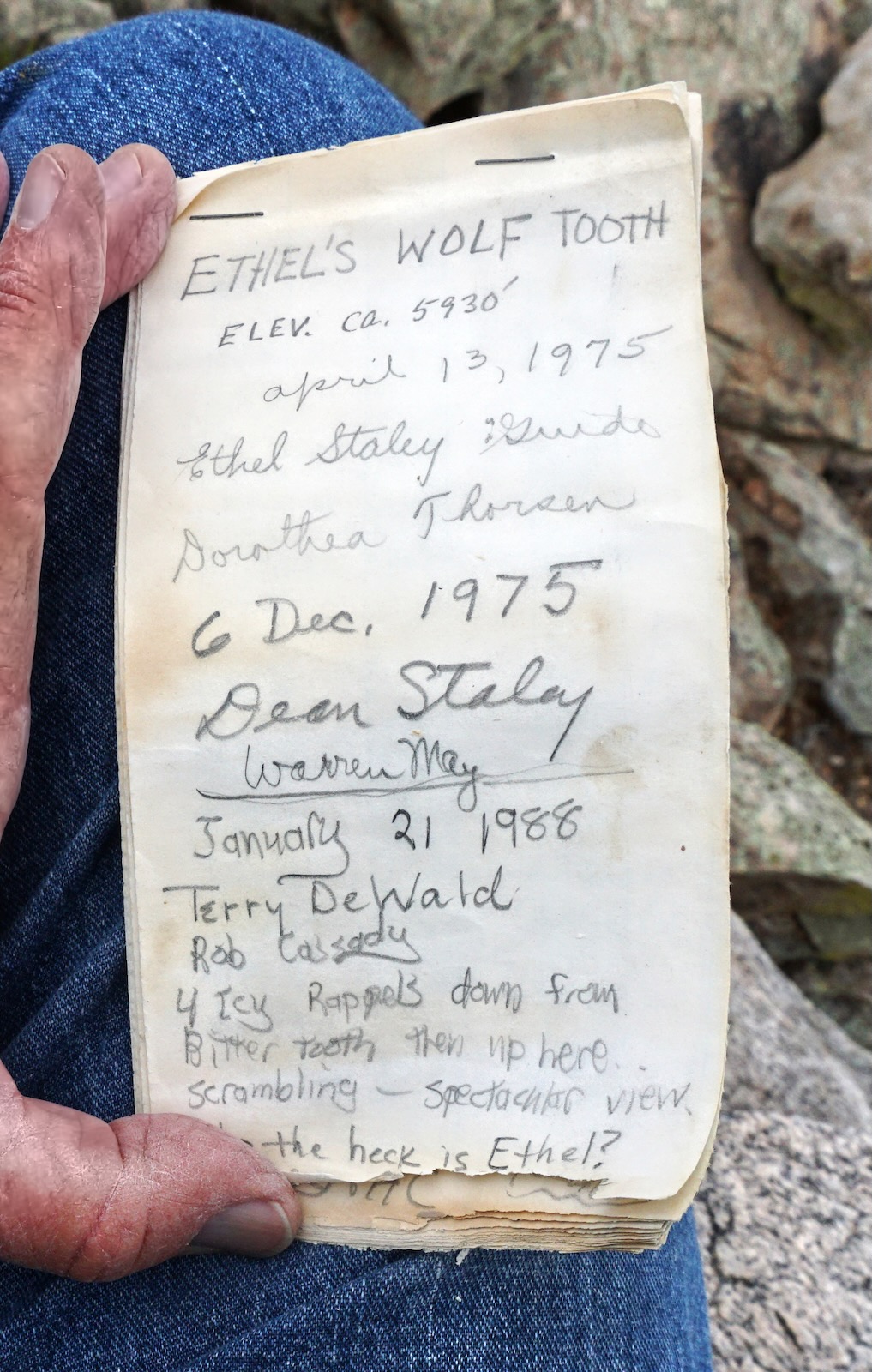 The peak register was placed by Ethel Staley in 1975. It is a few stapled sheets in a small glass jar. Ethel's husband Dean climbed the point a few months later. This same couple is credited with naming Valentine Peak in the early 1980s. In the fifty years that have lapsed since Ethel left the register there have been long gaps between visits. Note that in 1988, two men rappelled off "Bitter Tooth" (Barrier Tooth) before scrambling up Canine. By then Ethel's name had lapsed into obscurity and we therefore took the liberty of suggesting a name consistent with the Wolves Teeth theme. (THW, photo)