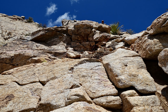 Canine demands a long approach on trail followed by steep off-trail pitches. Don't leave the Pima Canyon Trail early. The terrain is too steep and too loose. Below, climbers are on the trail picking up elevation. Soon, they will leave the track and hang a 90 degree left. Notice the cracked block in the center of the image below. The route passes just to the east of it.
